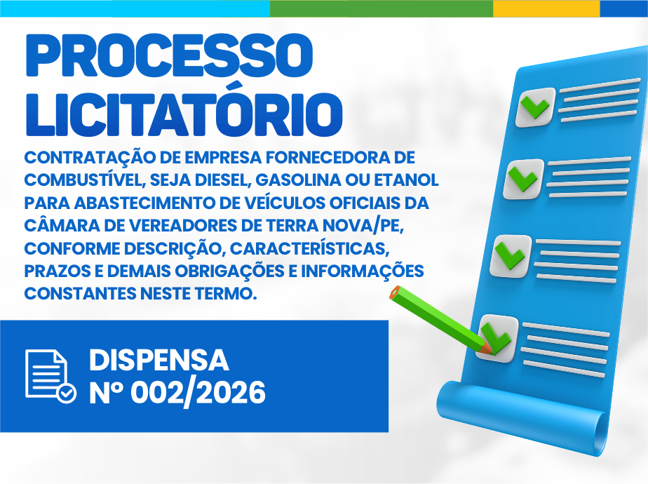 A CÂMARA MUNICIPAL DE VEREADORES DE TERRA NOVE-PE Inscrita no CNPJ N° 24.299.307/0001-01, com sede na Praça São Sebastião, 1962, Centro, Terra Nova - PE, CEP: 56.190-000, torna público aos interessados que realizará DISPENSA, com critério de julgamento MENOR PREÇO POR ITEM, nos termos do Artigo n° 75, inciso II da Lei 14.133/2021 e Decreto Municipal n° 001/2024, conforme os critérios e procedimentos definidos em Termo de Referência publicado no portal da Transparência (https://tenosoftsistemas.com.br/transparencia/pe/terranova/camara), objetivando obter, a menor proposta para CONTRATAÇÃO DE EMPRESA FORNECEDORA DE COMBUSTÍVEL, SEJA DIESEL, GASOLINA OU ETANOL PARA ABASTECIMENTO DE VEÍCULOS OFICIAIS DA CÂMARA DE VEREADORES DE TERRA NOVA/PE, CONFORME DESCRIÇÃO, CARACTERÍSTICAS, PRAZOS E DEMAIS OBRIGAÇÕES E INFORMAÇÕES CONSTANTES NESTE TERMO.